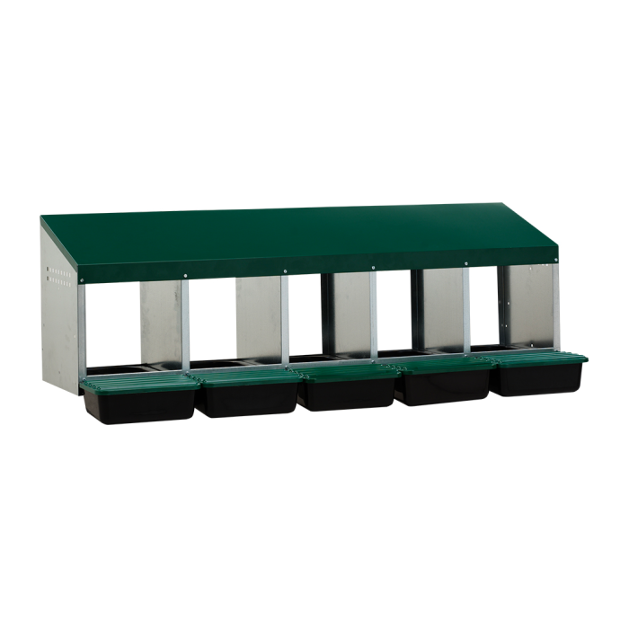 Bij dit vijfdubbele legnest rollen de eieren automatisch in aparte bakjes, aan de voorzijde van het legnest. De eieren zijn hierdoor gemakkelijk uit te rapen en tevens onbereikbaar voor de kippen.