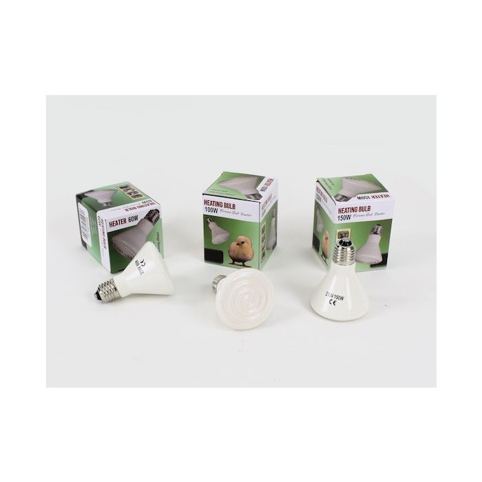 Deze warmtelampen voor kuikens zijn verkrijgbaar in de maten 60, 100 en 150 Watt.