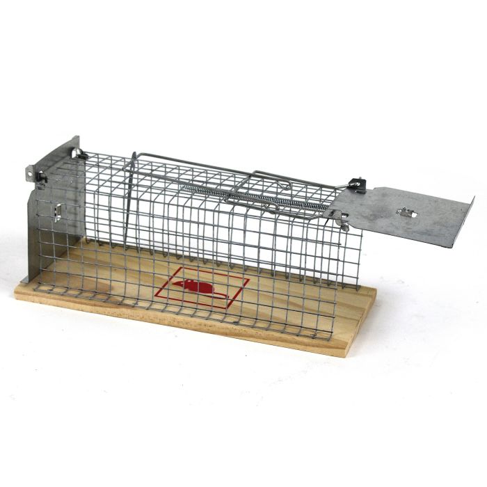 Diervriendelijke rattenvangkooi met houten bodem, geschikt voor het meermaals levend vangen van ratten. Plaats het aas aan de haak en zet de deur van de val open. De achterkant van de val kan worden geopend, zodat u eenvoudig bij de haak kunt. Zodra de rat van het aas eet, valt de deur dicht en zit de rat veilig opgesloten.