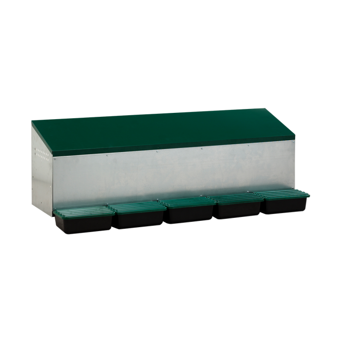 Bij dit vijfdubbele legnest rollen de eieren automatisch in aparte bakjes, aan de voorzijde van het legnest. De eieren zijn hierdoor gemakkelijk uit te rapen en tevens onbereikbaar voor de kippen.